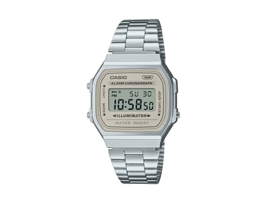 CASIO VINTAGE A168WA-8AYESCon el CASIO VINTAGE A168WA-8AYES te transportarás al estilo clásico con un diseño que mezcla lo retro y lo urbano. Su sutil forma cuadrada y la tonalidad gris de su esfera le confieren un carácter único que nunca pasa de moda.