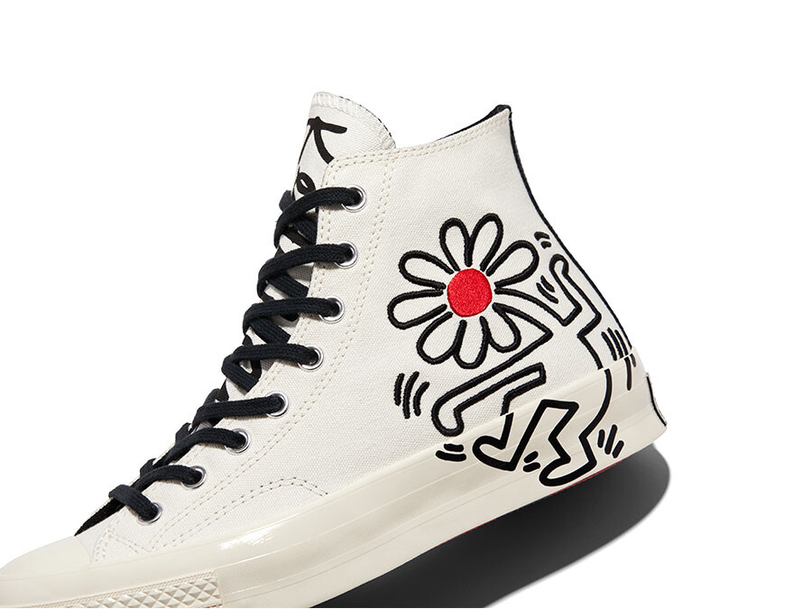 El ícono de Converse, las Chuck Taylor 70 es vestida en esta ocasión por los dibujos del conocido artista pop Keith Haring. Sobre la clásica lona en color blanco, color que también viste la mediasuela destaca una figura en cabeza de flor bordada transmitiendo mensaje del artista que rompió barreras y trascendió a varias disciplinas como el arte, la moda o la música.