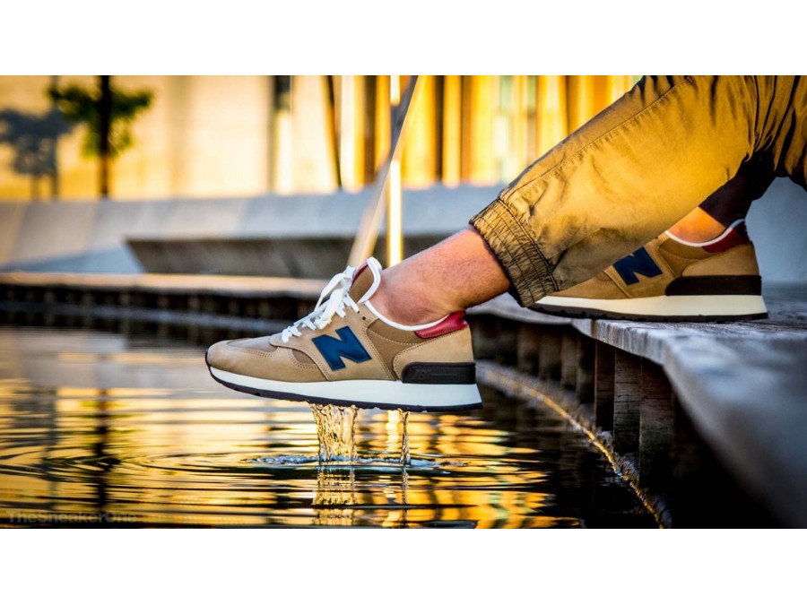Empezamos por la New Balance M990 (DAN), la que es para nosotros una de las zapatillas más cómodas de la marca americana. La zapatilla viene en una combinación de colores perfectos para la época a la que nos dirigimos, con el beige como color principal en todo el upper fabricado en suede de primera calidad y nylon. En contraste nos encontramos con toques en azul, como en el logo, o el talón y el logo de la lengüeta en burdeos. La media suela con EVA de doble densidad y la suela Vibram proporcionan una gran agarre y una buena amortiguación en la pisada.