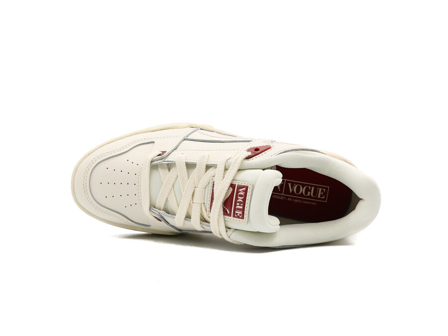 La famosa revista americana con gran influencia en el mundo de la moda colabora con Puma para lanzar esta exclusiva colección compuesta por algunas de las referencias más reconocibles de la firma realizando una aproximación entre el streetwear y las pasarelas. Las Puma Slipstream Vogue son una interpretación minimalista de esta zapatilla de retrobasket., en color blanco con detalles en el rojo intenso que identificamos con la publicacion.