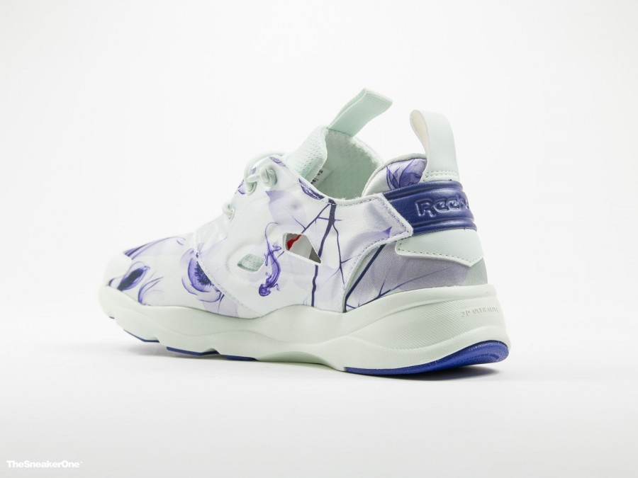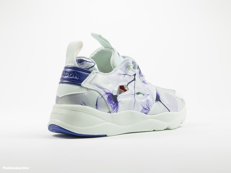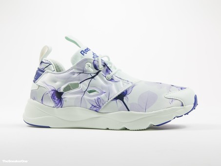 Inspirada en el ícono de la Instapump fury, reebok nos propone una versión más ligera y cómoda que mantiene el espíritu de la original. El modelo que os presentamos para mujer viene con un estampado floral de color morado sobre fondo blanco.
